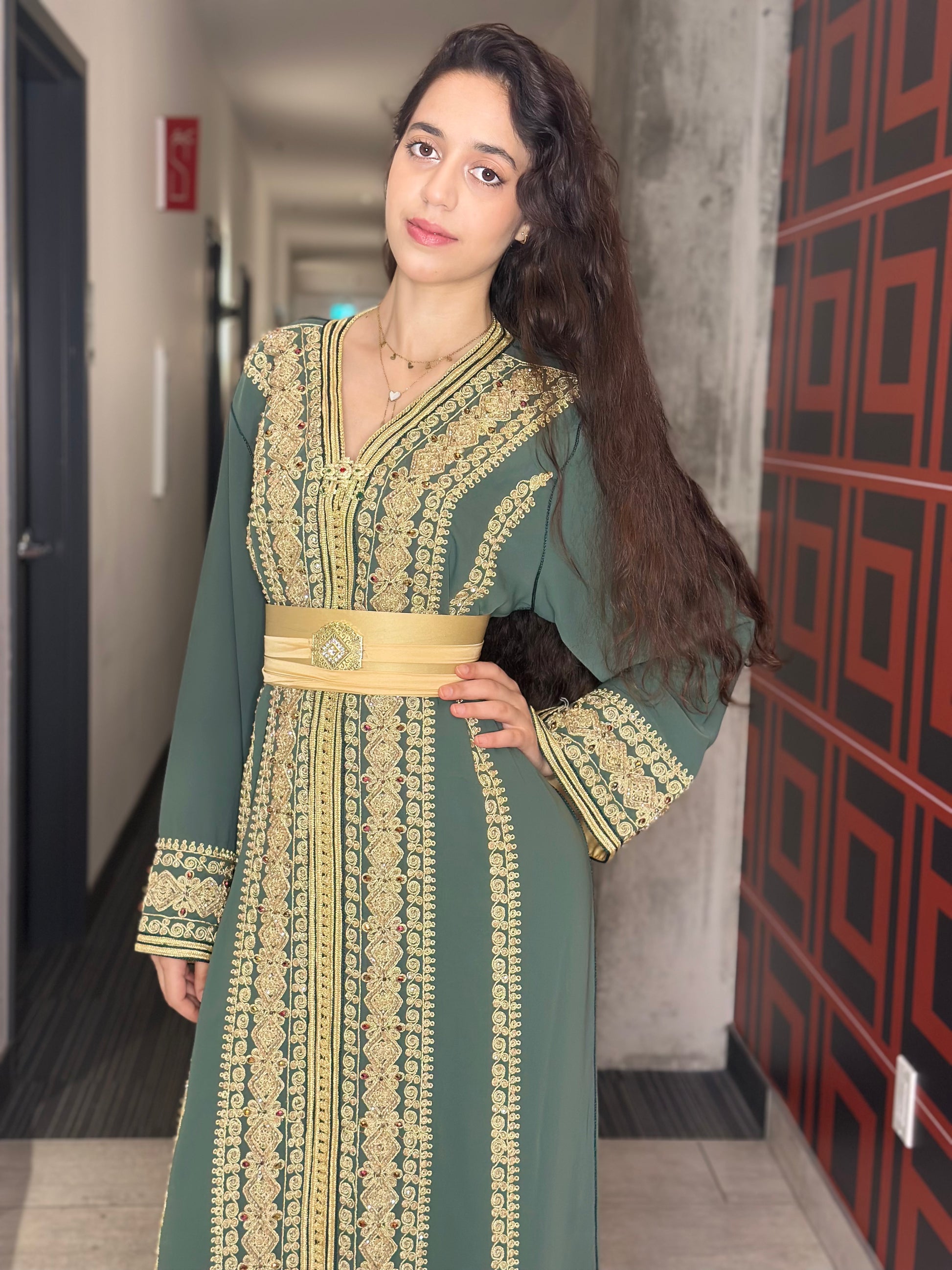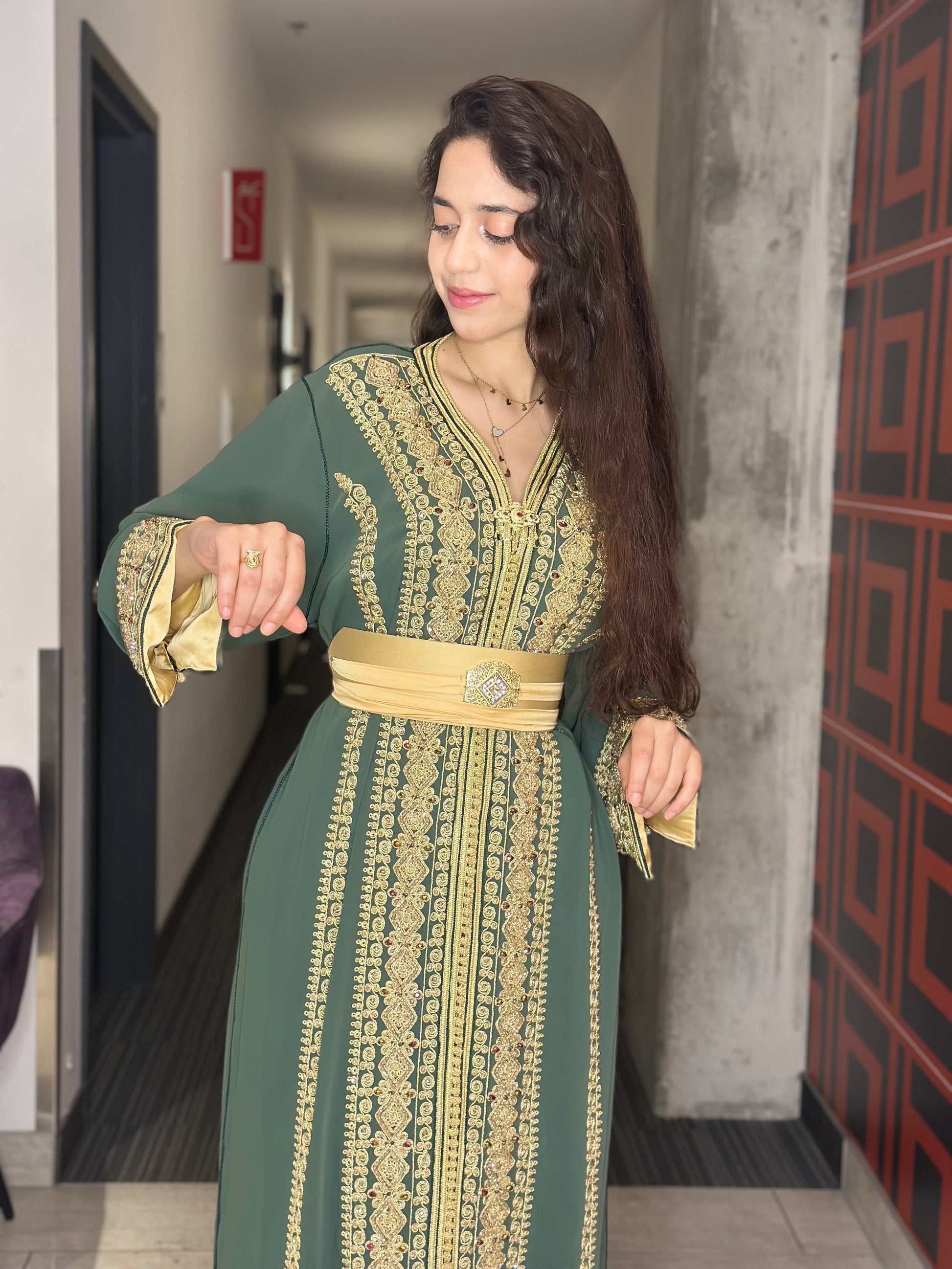 Sublimez vos moments les plus précieux avec ce caftan marocain raffiné. Conçu en crêpe coréen haut de gamme et orné de finitions artisanales délicates, il incarne l’élégance et le savoir-faire traditionnel. Sa ceinture assortie, offerte gratuitement, souligne la silhouette avec grâce et féminité.